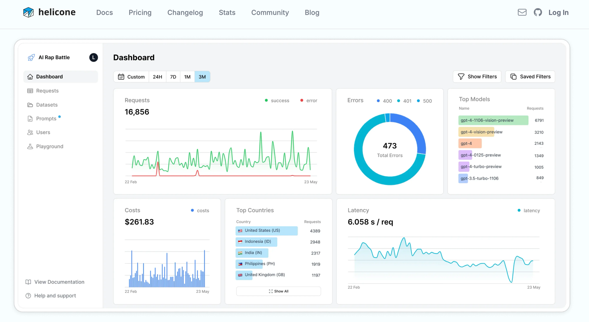 Helicone tracks latency, response times and user errors, helping your team understand key issues and improve your model’s performance.