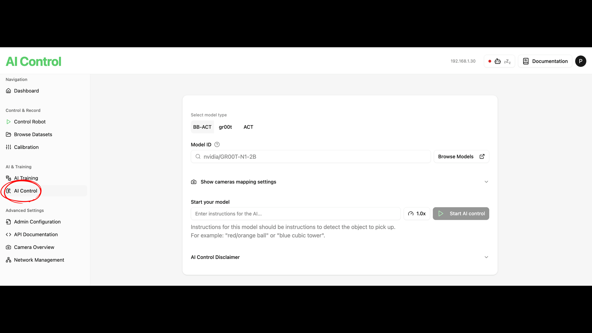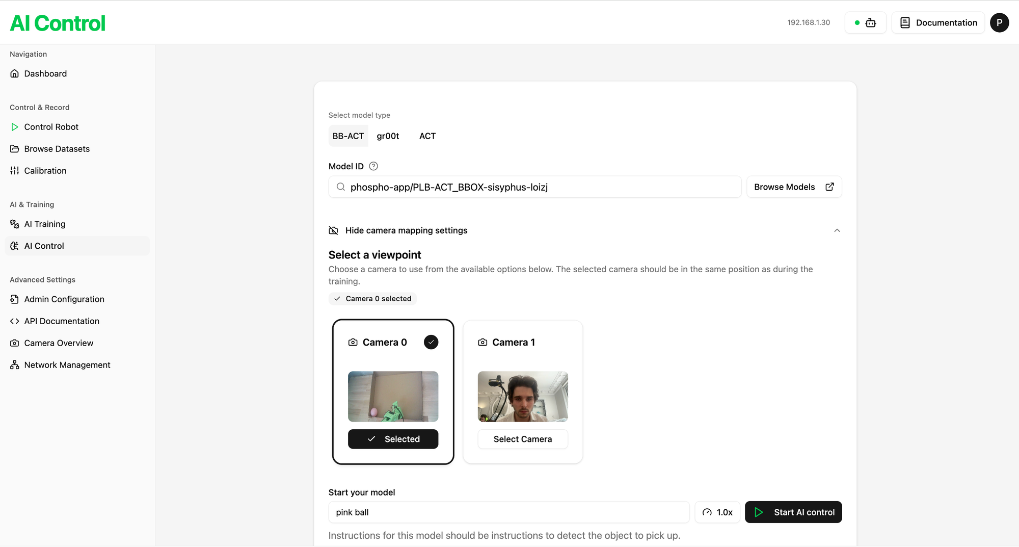 Click the Start AI control button. The model will now use the context camera to locate the "pink ball" using the bounding box detector, and the robot will execute the actions to pick it up.