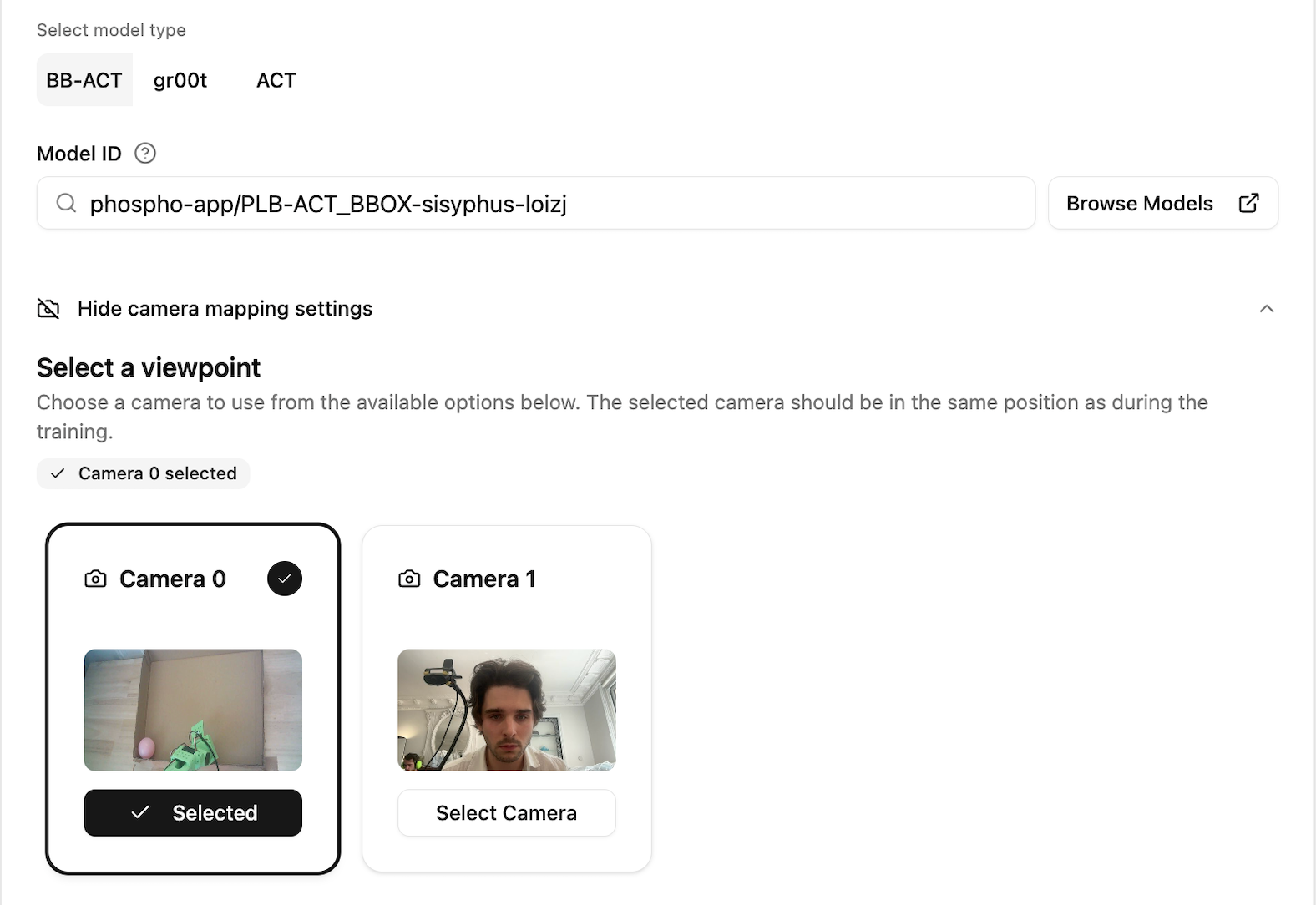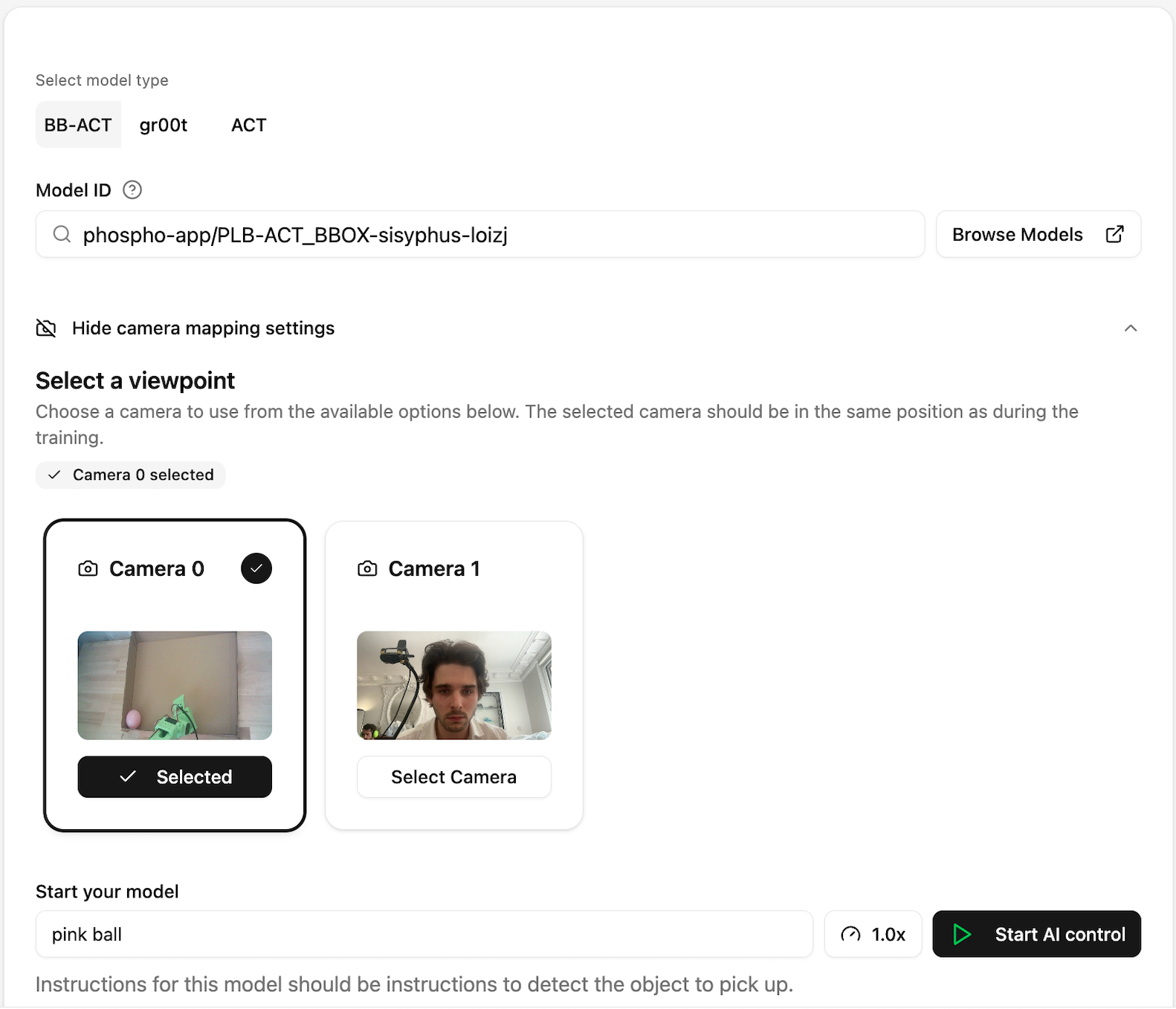 - The Context Camera is Your Model's Eyes: it provides the overall scene information to the AI. It's crucial that this camera can see the target object at all times. Before you proceed, verify your camera feed in the phospho dashboard.