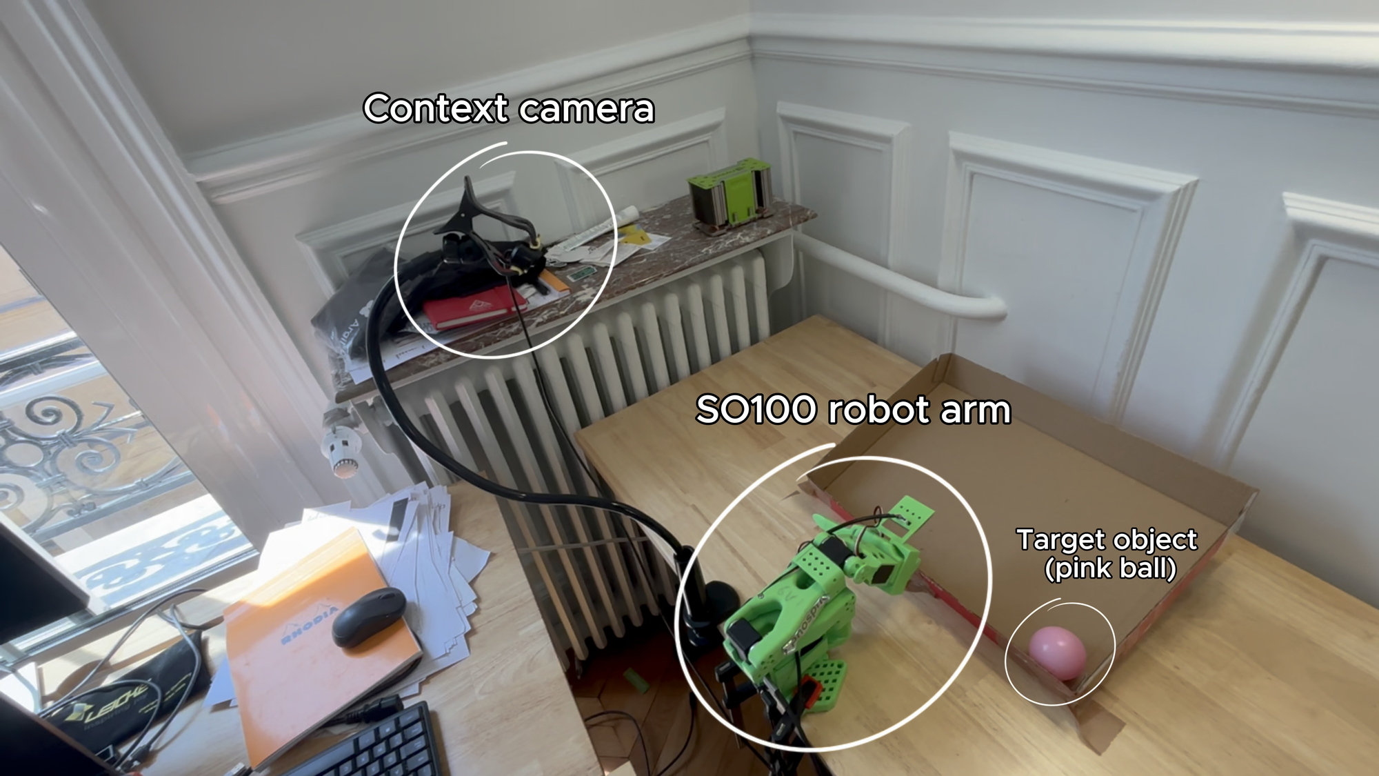 - The physical setup you use for recording your dataset must be identical to the setup you use for testing (inference) later. If you move the context camera even slightly after training, the model's performance will degrade significantly because its spatial understanding of the world will be incorrect.