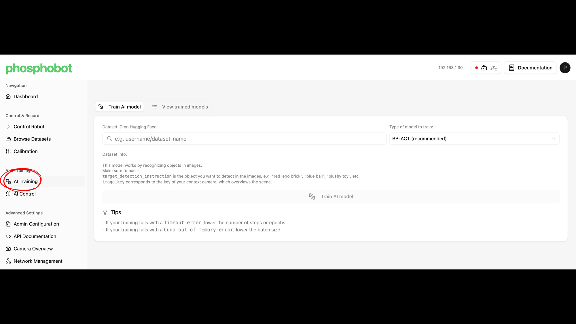 In your phospho dashboard, go to the AI & Training section and click on AI Training.
