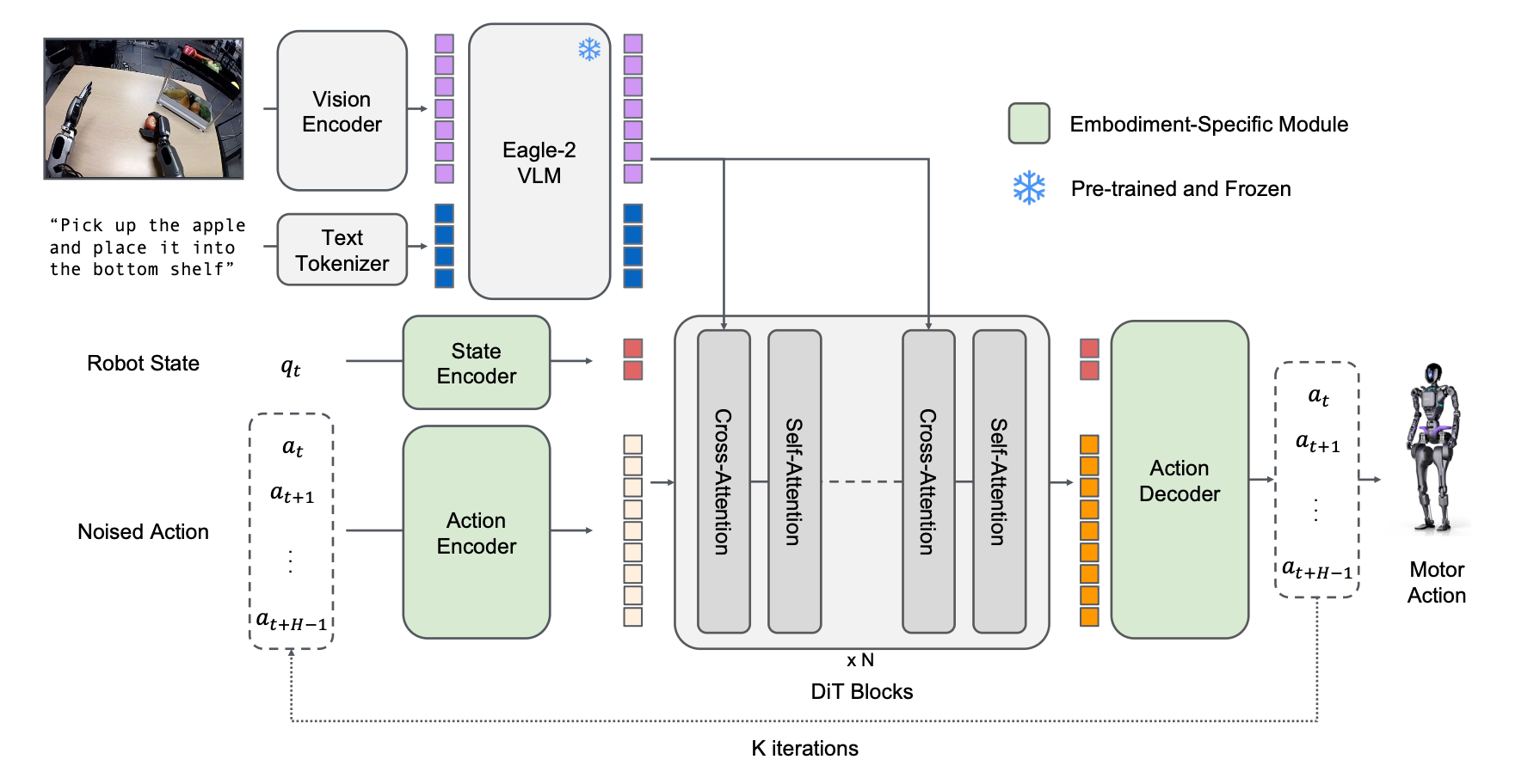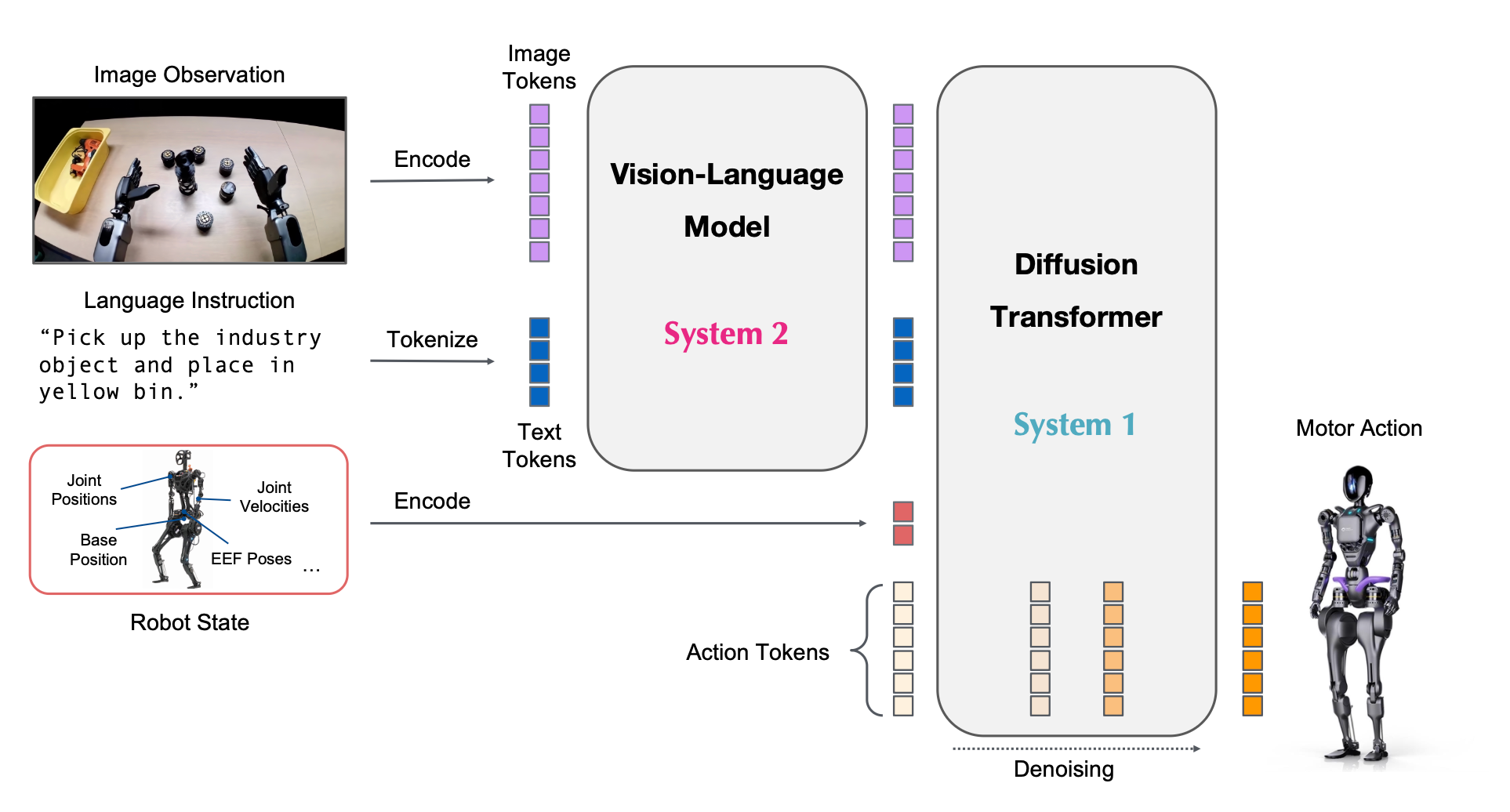 This is the reasoning backbone, a pre-trained Vision-Language Model (VLM) named Eagle-2, fine-tuned from SmolLM2 and SigLIP-2. Running at 10 Hz on an NVIDIA L40 GPU, it processes 224x224 resolution images and text instructions, producing tokens that encapsulate the environment and task goals. Think of it as the deliberative mind, interpreting what needs to be done. - System 1: Diffusion Transformer