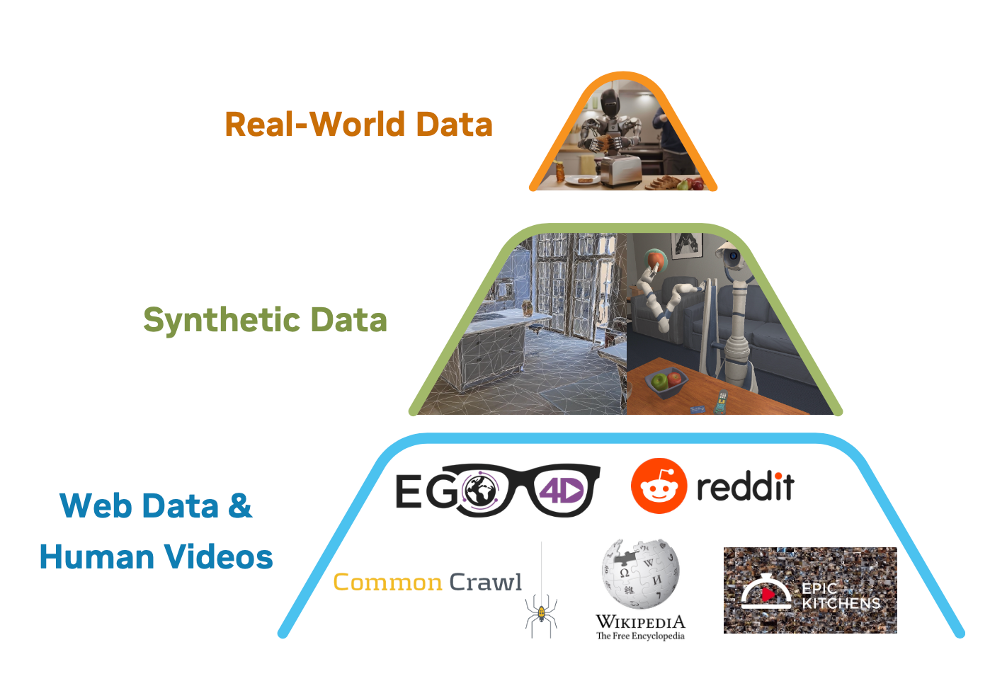 Training a robotics foundation model demands massive, varied data, but real-robot trajectories are scarce. GROOT N1 addresses this with a data pyramid: