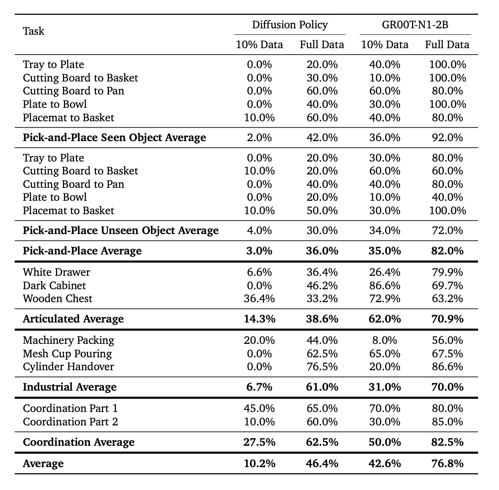 Deployed on the Fourier GR-1, GROOT N1 excels in tasks like pick-and-place (82% average success with full data) and articulated object manipulation (70.9%), demonstrating high data efficiency even with 10% data (42.6% average).