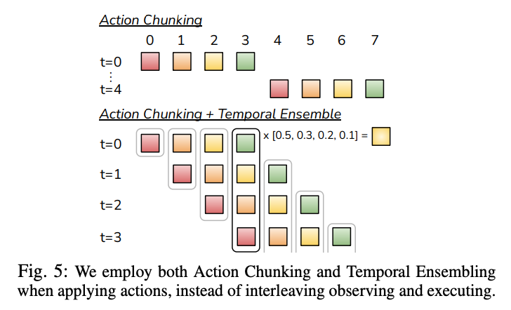 Drawing inspiration from neuroscience, where actions are grouped into chunks for efficient execution, ACT predicts a sequence of ( k ) actions (target joint positions for the next ( k ) timesteps) given the current observation, rather than a single action. This reduces the effective task horizon by a factor of ( k ), mitigating compounding errors. For a task with 500 timesteps at 50Hz (10 seconds), setting ( k=100 ) reduces the horizon to 5 steps, making it easier for the policy to stay on track.