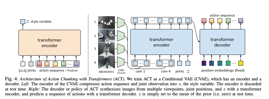 ACT introduces a novel approach to imitation learning by predicting sequences of actions and leveraging transformer-based sequence modeling. Its key components are action chunking, temporal ensembling, and a CVAE-based policy.