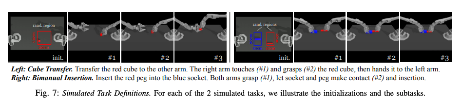 Human demonstrations are inherently stochastic, with variations in trajectories for the same task. For example, in a tape handover task, the exact mid-air handover position varies across episodes, but the policy must ensure the grippers avoid collisions and grasp correctly. To handle this, ACT trains the policy as a Conditional Variational Autoencoder (CVAE), which models the distribution of action sequences conditioned on observations.