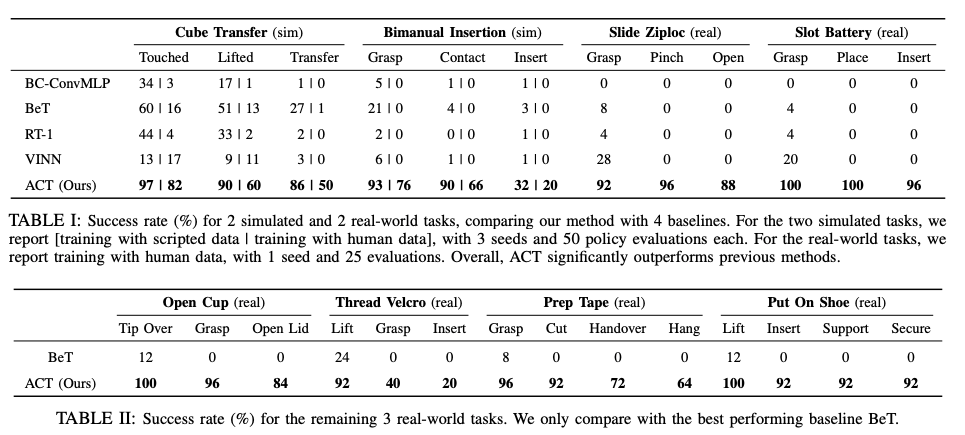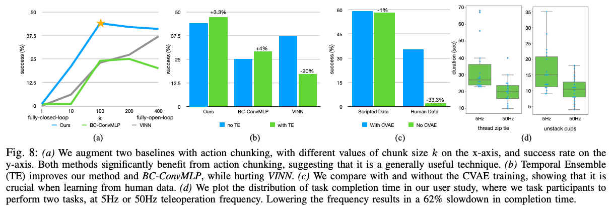 - Action Chunking: Success rates improve from 1% at ( k=1 ) (no chunking) to 44% at ( k=100 ), with a slight drop at higher ( k ) due to reduced reactivity