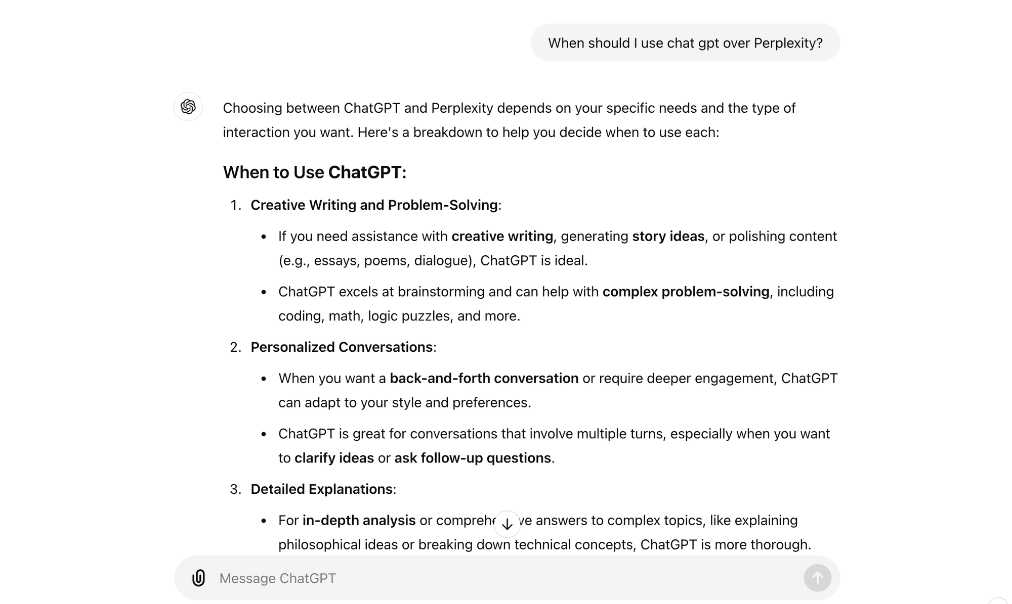 - This also means Perplexity is better for factual queries and sourced answers, whereas ChatGPT is better for content creation and problem solving.