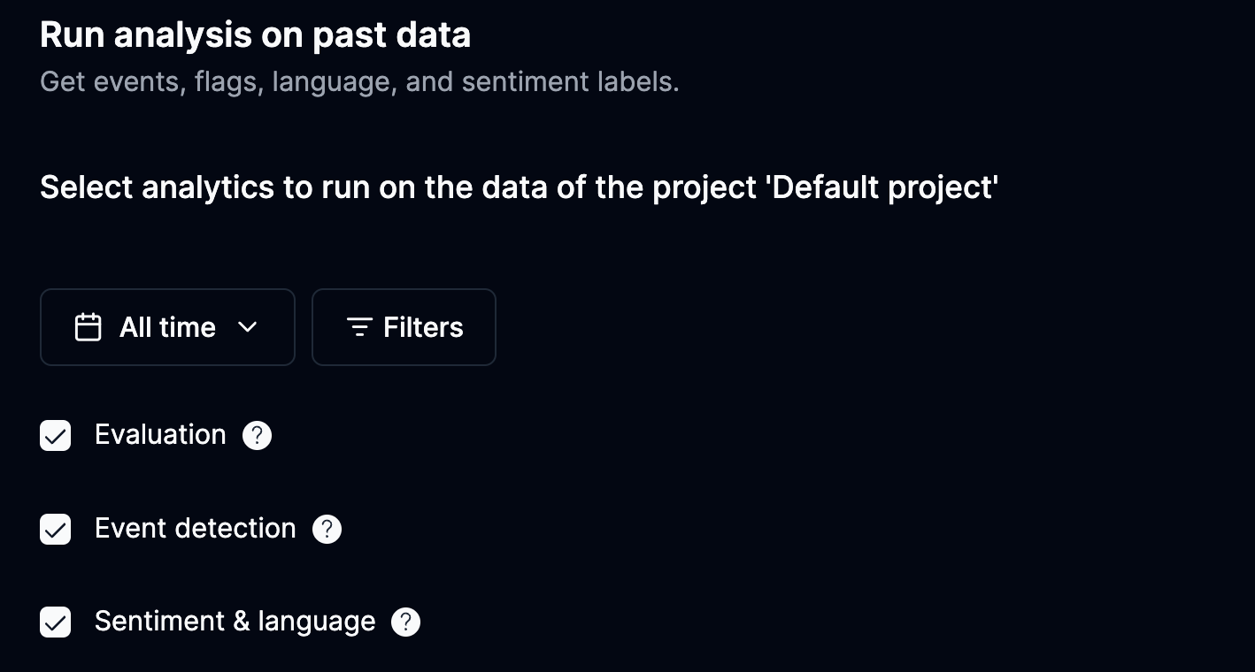 - Rerun Past Analytics: Now you can rerun sentiment analytics, language detection, and evaluations from past sessions. Just hit the new button in the Tasks tab and settings.