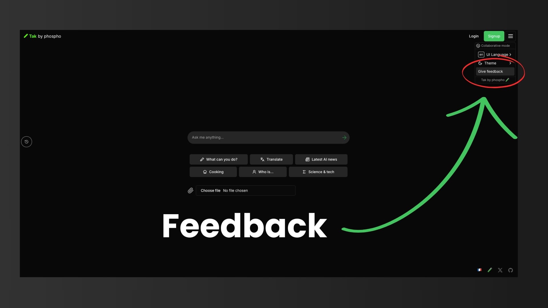 For you: given that Tak is in its early stages - we’re welcoming feedback from our users to give you a voice in driving future features by sharing your thoughts. You can see in the image below where you can suggest improvements for us to implement e.g upload images and files, custom instructions, threads etc.