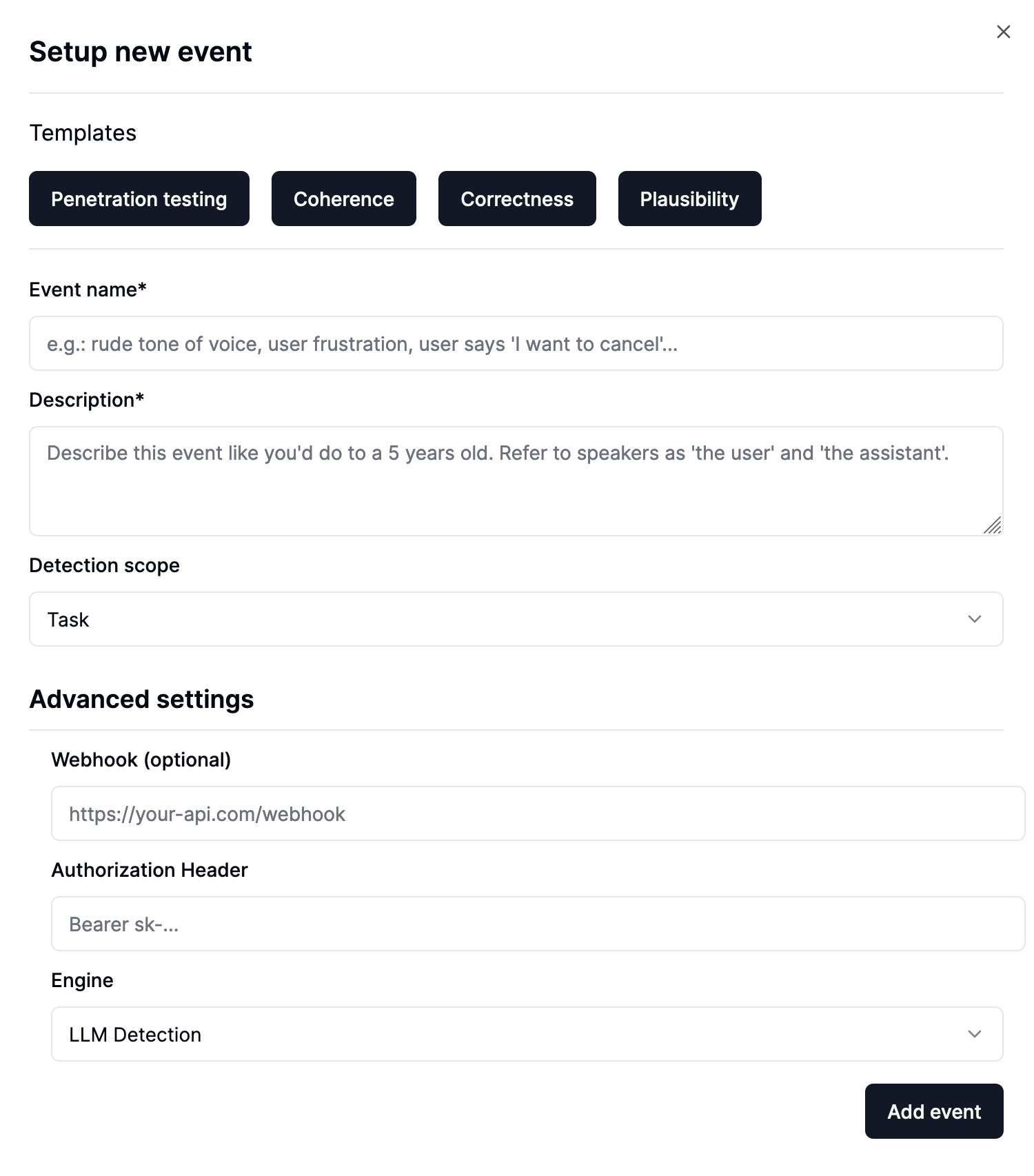 - Set up events or webhooks (optional): receive real-time notifications when your KPI is detected e.g Phospho notifications, Slack messages, SMS, emails etc.
